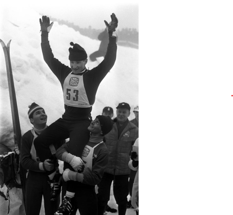 VM: Hopprenn, stor bakke, ble vunnet av Bjørn Wirkola som her bæres på gullstol etter seieren i 1966. Foto: NTB