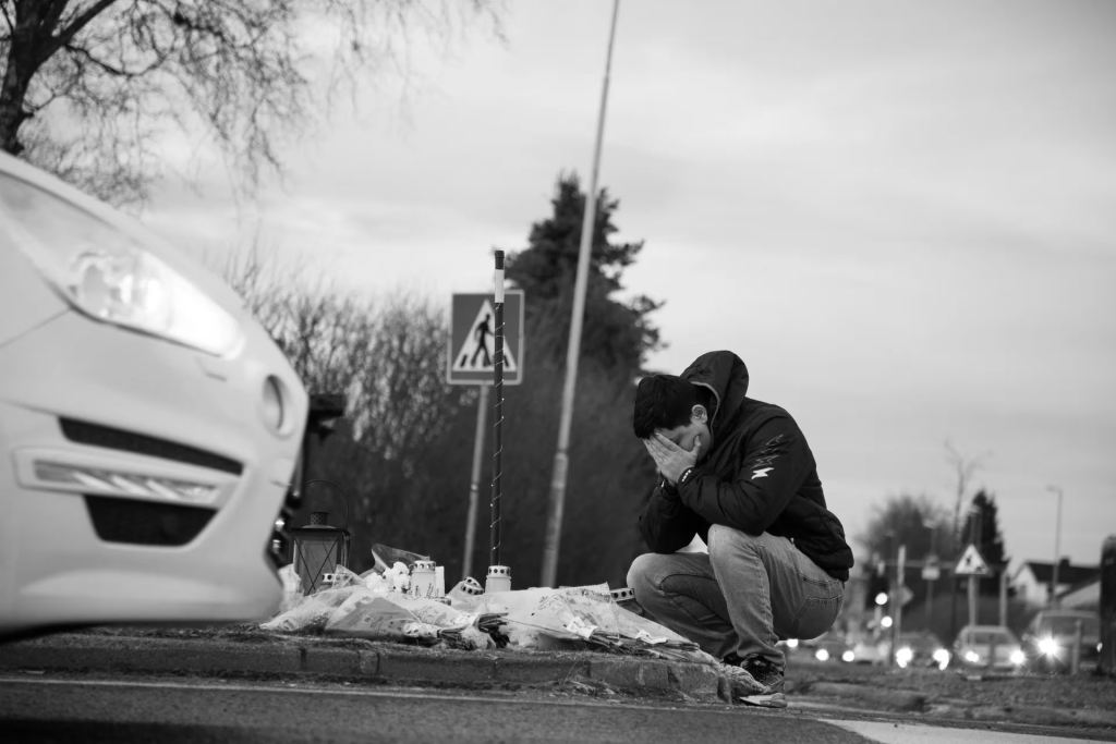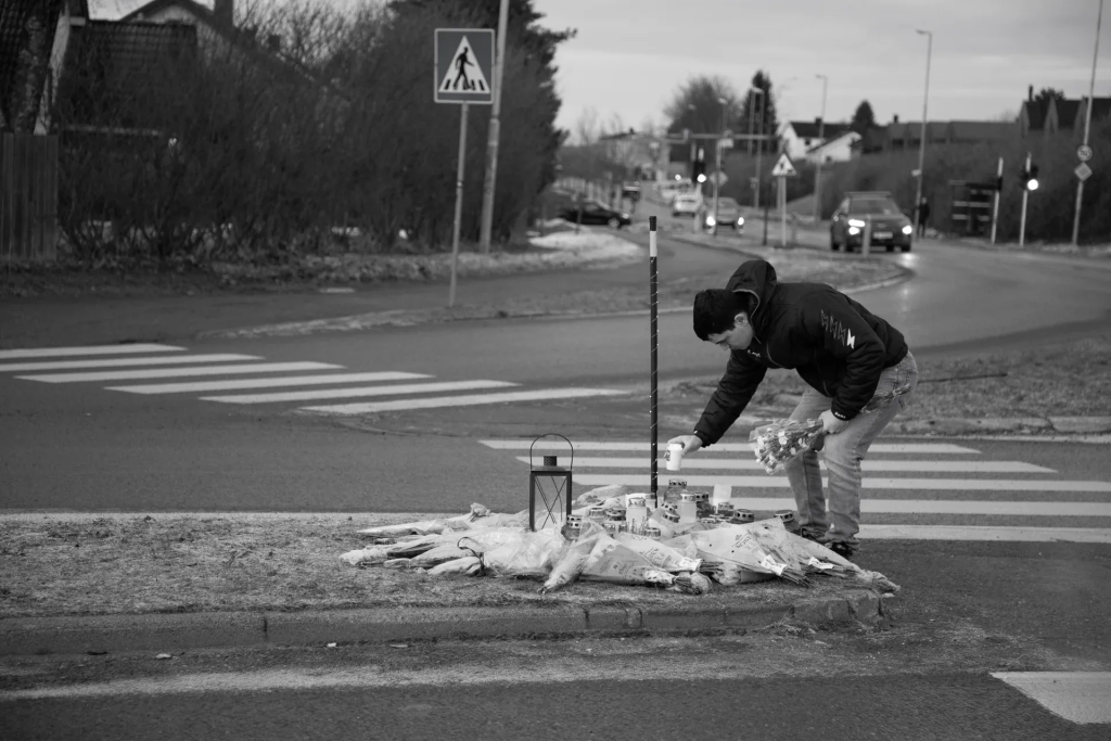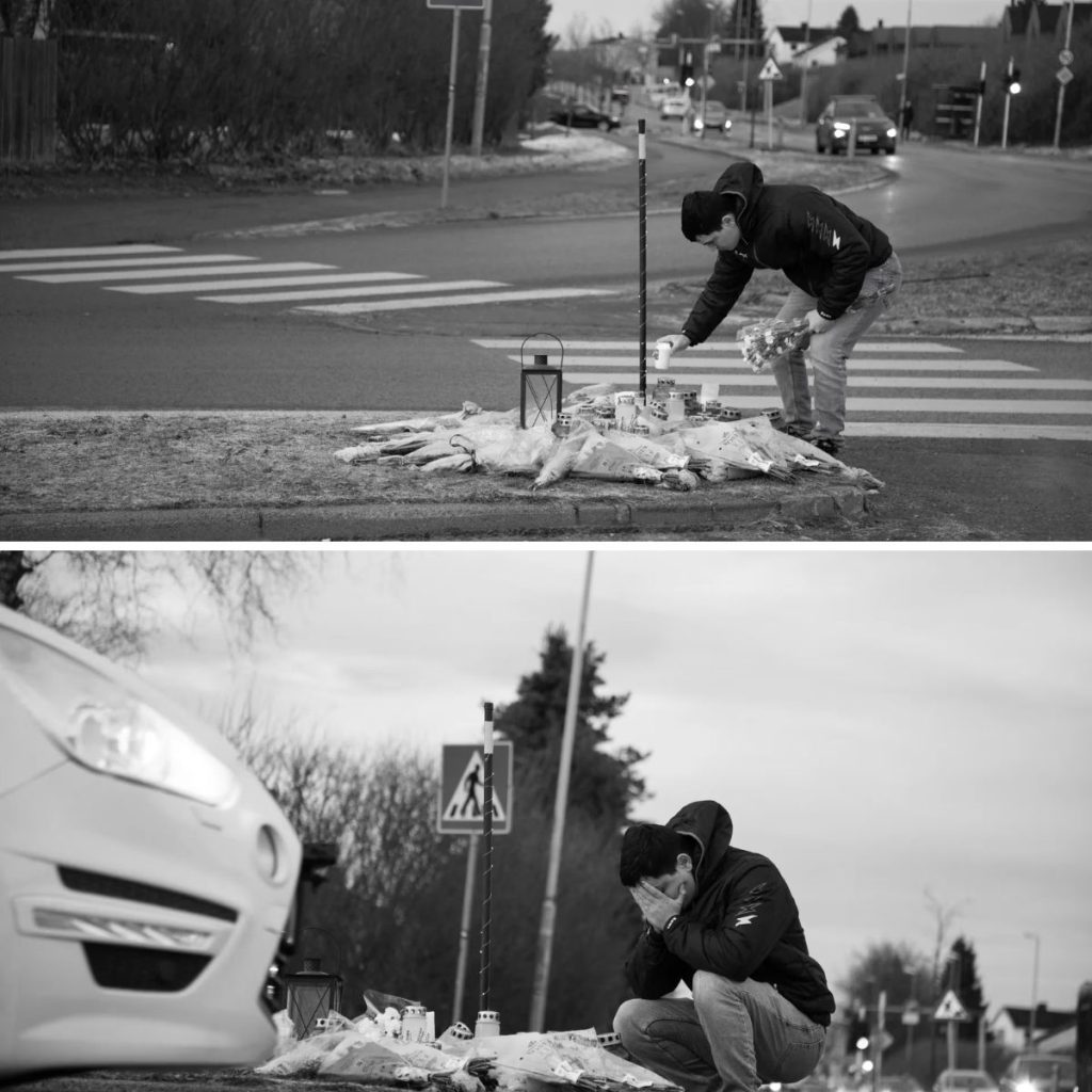 Han legger hånden ned på den kalde asfalten, som om han leter etter det aller siste sporet av brorens varme.