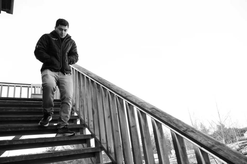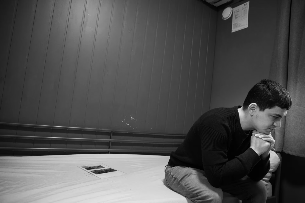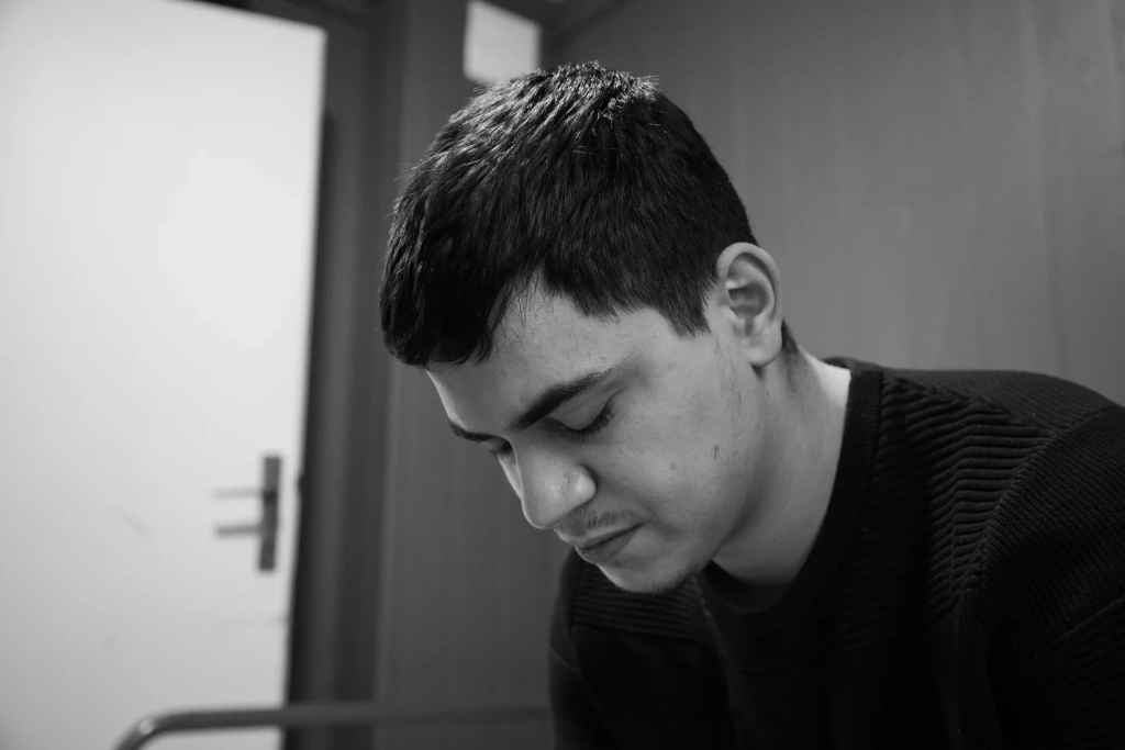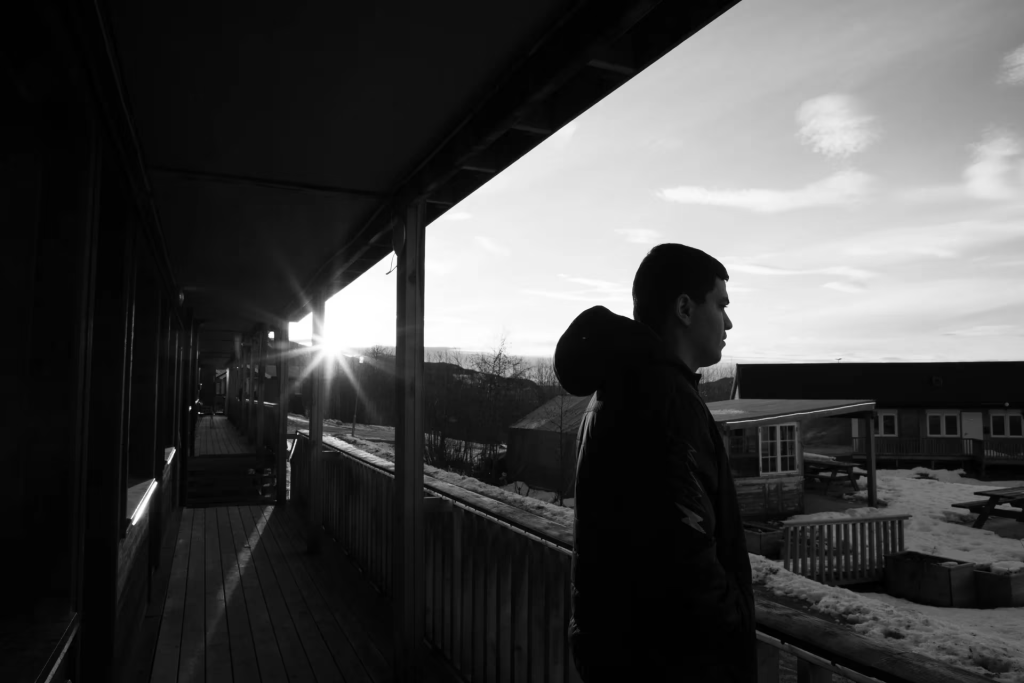 På mottaket står han alene og ser utover gårdsplassen. Her prøver han å finne ro.