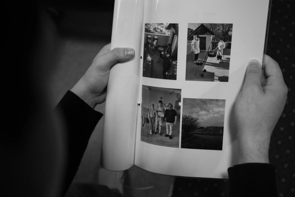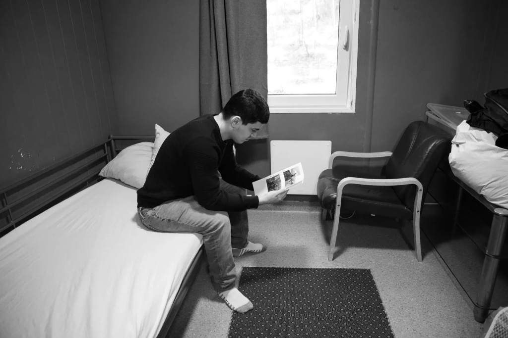 På det lille rommet på mottaket sitter Abdin på sengen. Han ser på gamle bilder.