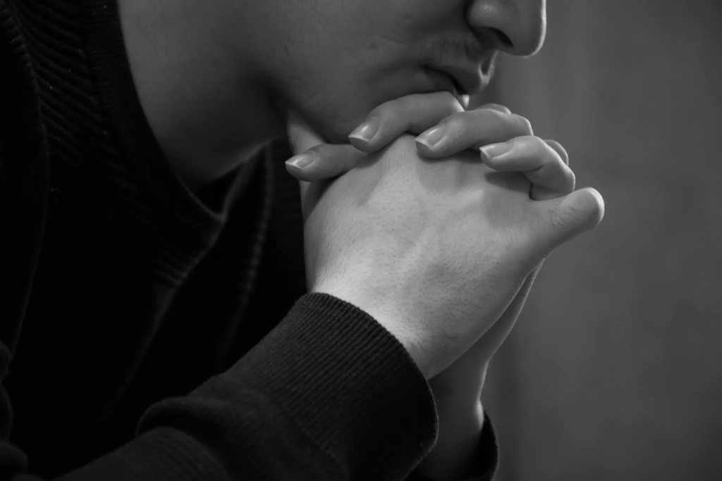 Hendene foldet, blikket festet i gulvet.