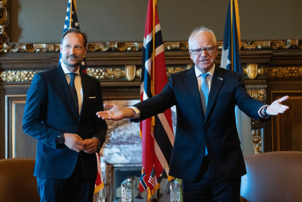 Den øverste representanten for det offisielle USA som Kronprinsen har møtt er guvernør og eks-kandidat som visepresident Tim Walz.
