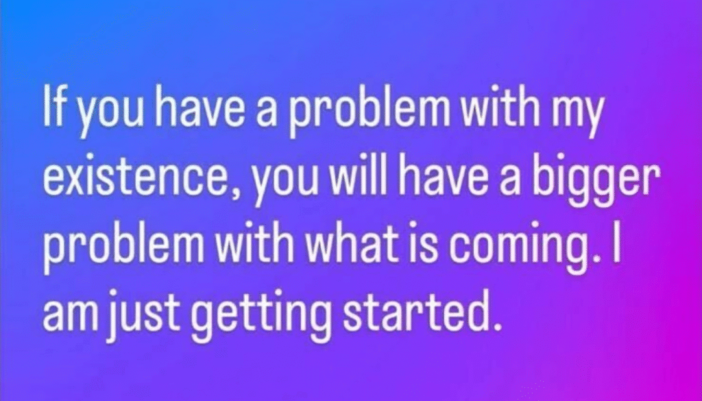 «Om du har problemer med min tilstedeværelse nå – vit at dere har et større problem i vente. Jeg har bare så vidt begynt», skriver han til et bilde på Instagrams historiefunksjon.