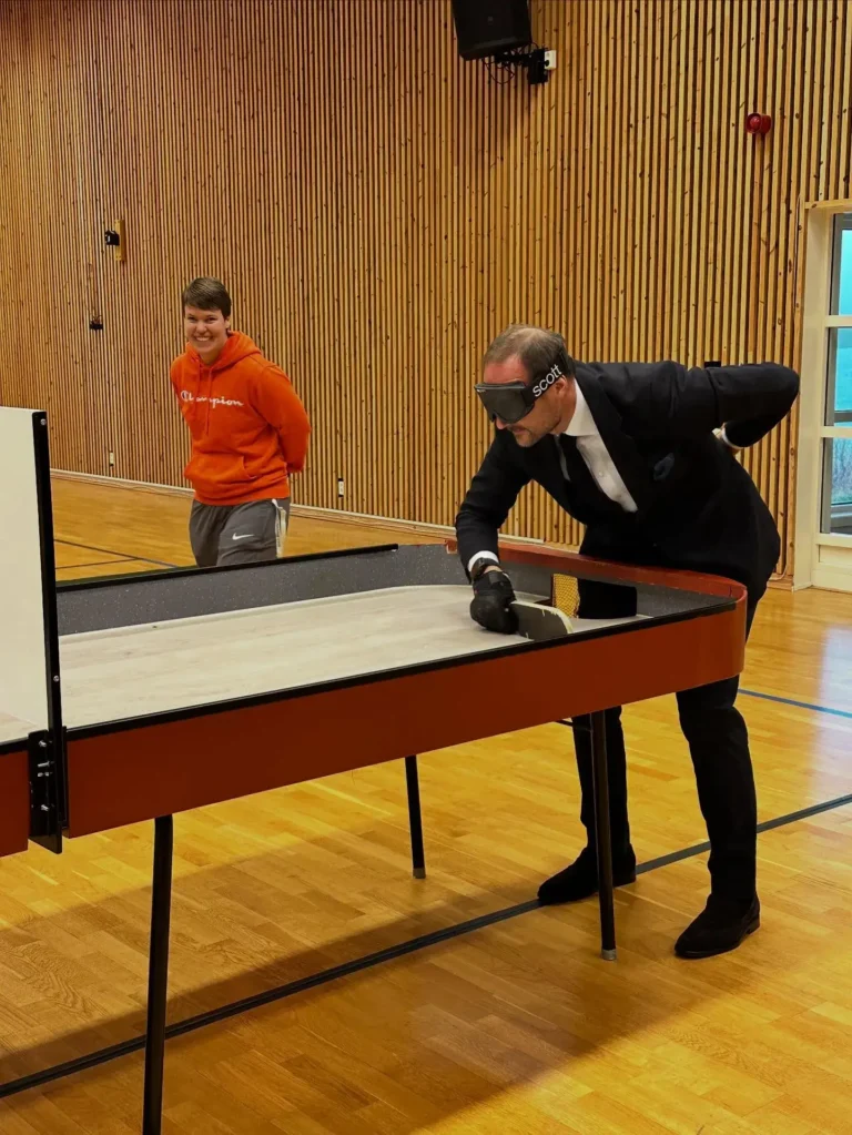 Deretter fikk han prøve show-down, en blanding av bordtennis og airhockey, hvor spillerne bruker briller som simulerer synstap. Til slutt tok han på seg briller som gjorde at han måtte spille helt i blinde.