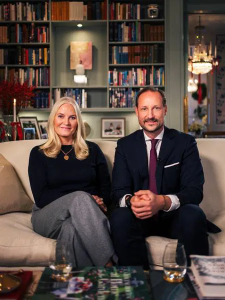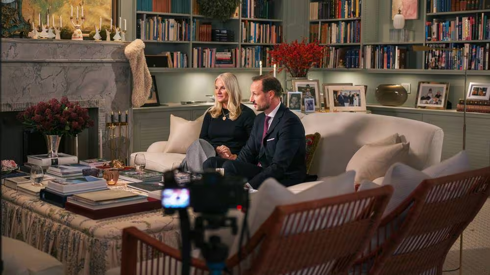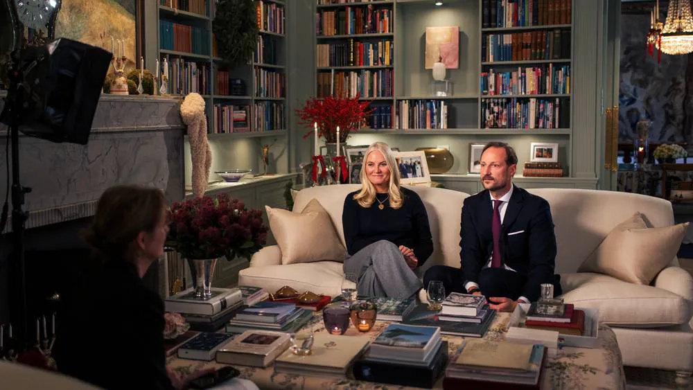 Kronprins Haakon og kronprinsesse Mette-Marit tar imot NRKs «Året med kongefamilien» hjemme på Skaugum.Foto: Christian Breidlid / NRK