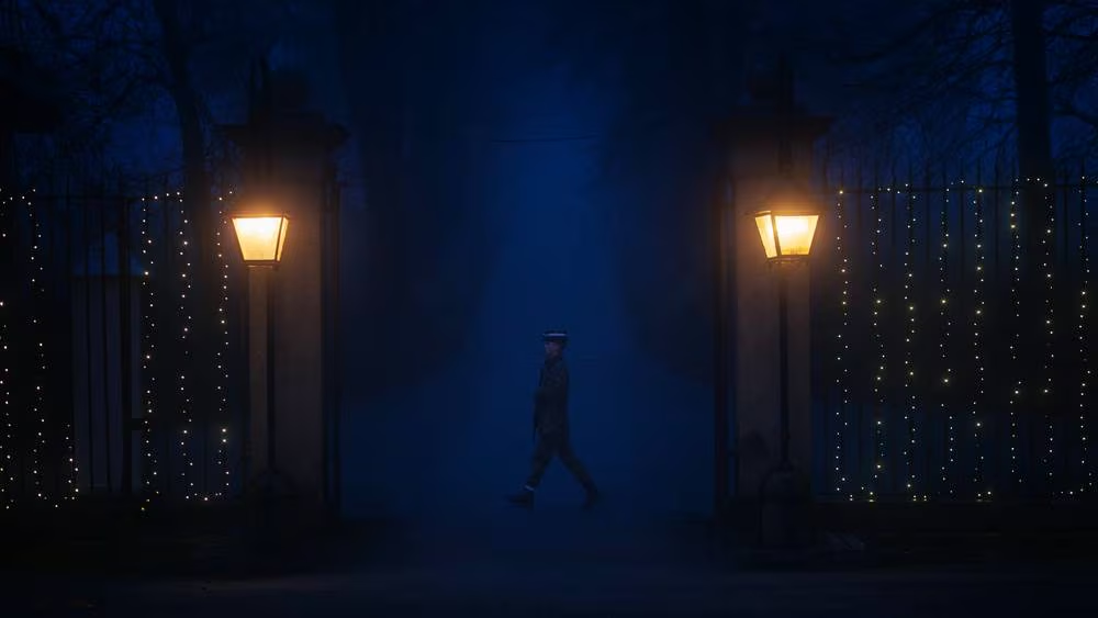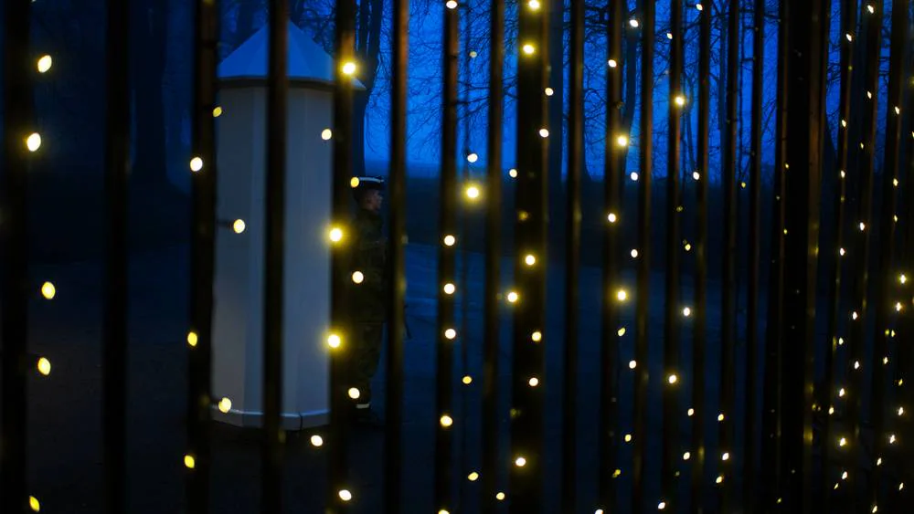 Julelys som er hengt opp på porten inn til Skaugum, lyser opp i vintermørket.Foto: Christian Breidlid / NRK