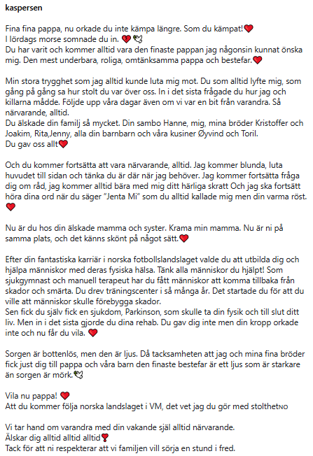 «Hvil nå, pappa! At du kommer til å følge det norske landslaget i VM, det vet jeg at du gjør med stolthet. Vi tar vare på hverandre, med din våkne sjel alltid nærværende.