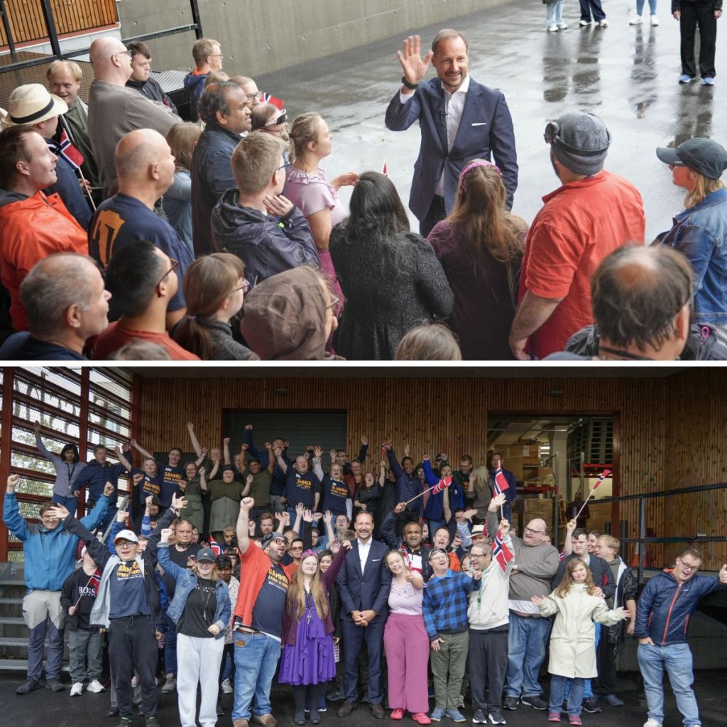 STERKT MØTE: Kronprins Haakon møtte de ansatte på Fossheim – en arbeidsplass og et fellesskap for mennesker med funksjonsvariasjoner. Her fikk han prøve seg i jobben. Foto: NTB