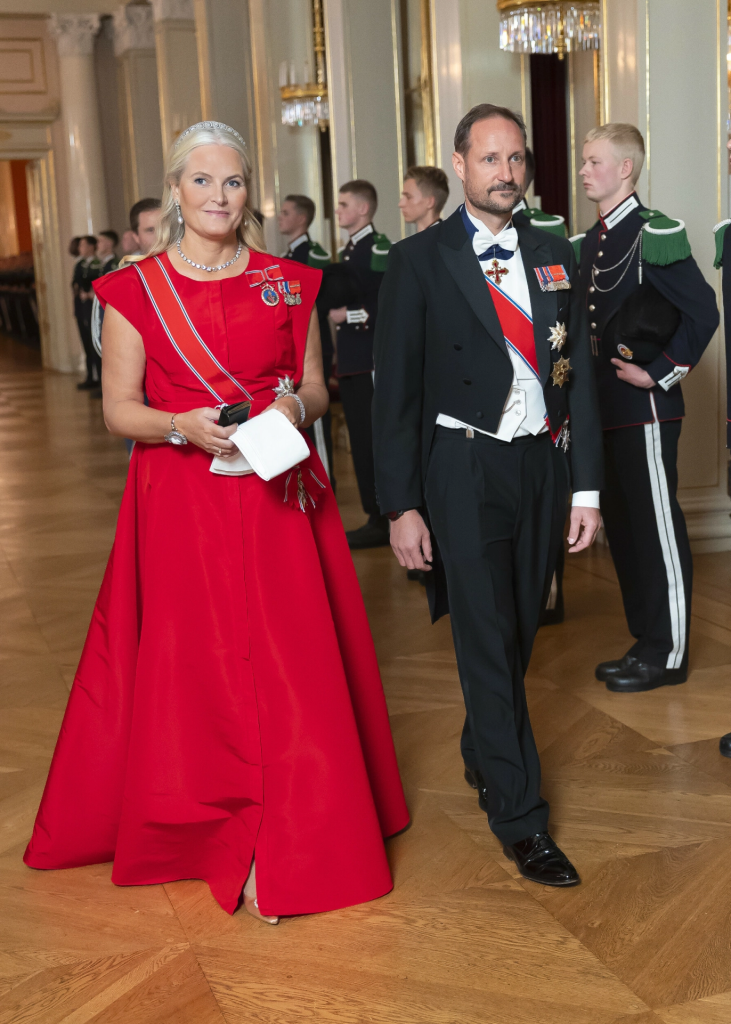 I tillegg til den slående vakre kjolen bar kronprinsessen også bryllupsdiademet sitt, som hun i sin tid fikk i gave fra kongeparet. Og selv om kjolen var ny, tydde Mette-Marit til gjenbruk når det kom til smykkene.