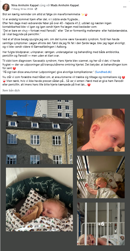 Da Louis begynte å få røde blodsprengte øyne og utslett etter at han startet på penicillin, ble Nina enda mer bekymret. Hun søkte selv opp symptomene på nettet – og fant noe som passet nøyaktig: Kawasakis syndrom, en sjelden betennelsessykdom som rammer små barn.