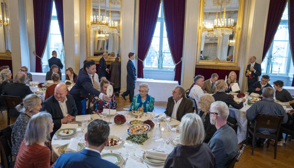 Etter visningen i KunstStallen bar det inn på Slottet – hbvor Sonja inviterte til middag ved runde bord.