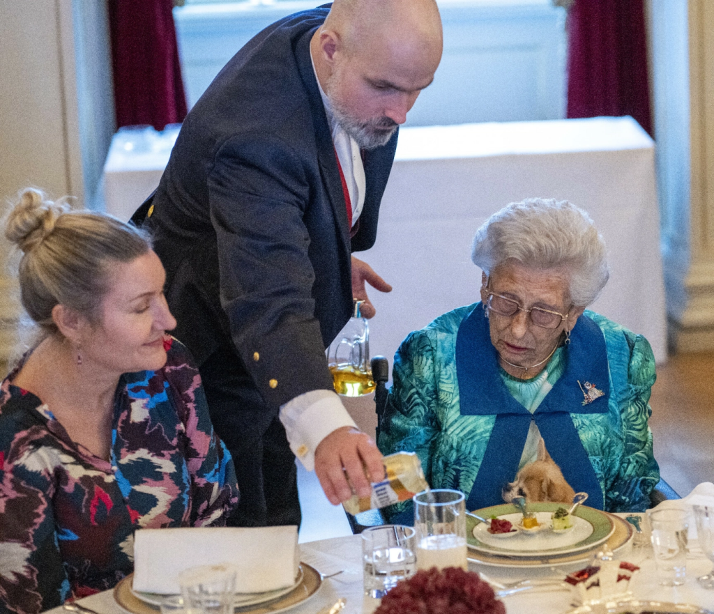 Hun satt ved det ene bordet og holdt hoff, mens prinsesse Astrid var i bordet i midten.