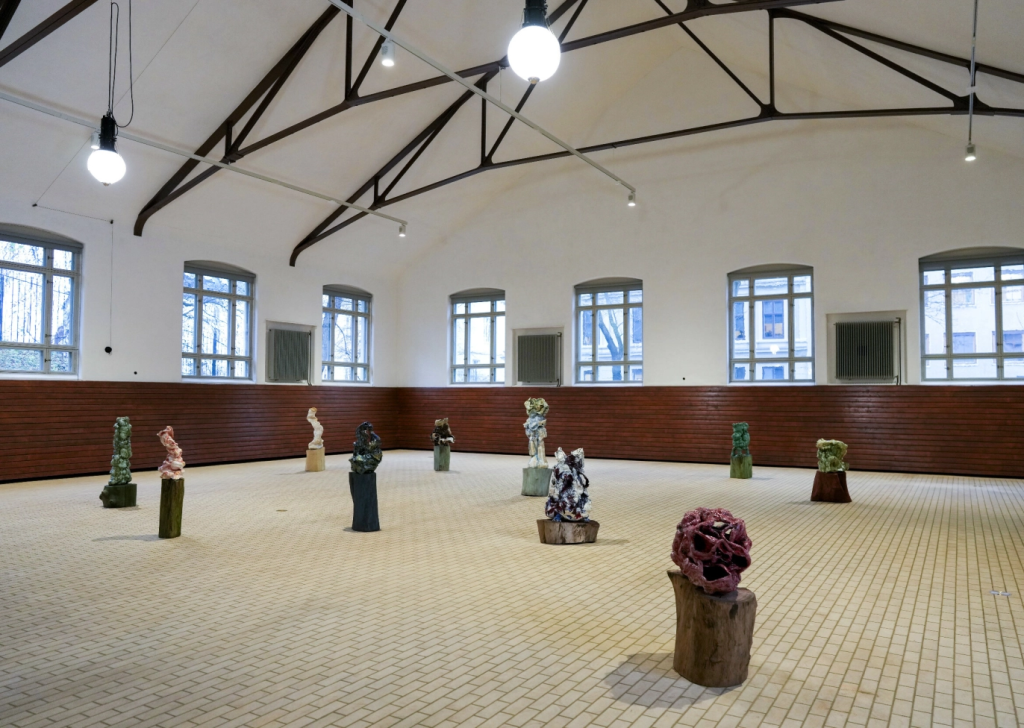Vi er fortsatt i gang med å restaurere bygningene her i stallkomplekset, og andre del av utstillingen møter dere i Ridehuset, som vi gjenåpnet for to år siden. Her har vi latt fire samtidskunstnere presentere sine nye kunstverk.