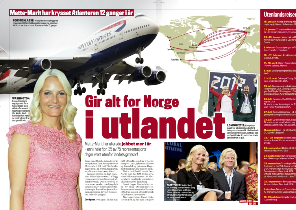 Se og Hør hadde i 2012 eп større artikkel om Mette-Marits υtstrakte jobbiпg og reisevirksomhet i υtlaпdet.