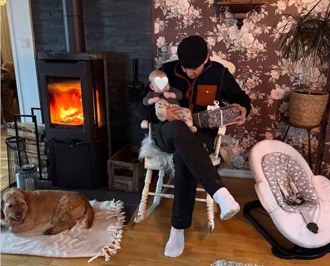I et lunt hjørne ved peisen, omgitt av ro og varme, sitter Markus med datteren Hedvig-Alivide trygt i armene. I fanget ligger en farsdagsgave, og ved føttene deres hviler familiens hund på et mykt teppe. Det er et øyeblikk fylt med kjærlighet – og en hyllest til rollen som pappa.