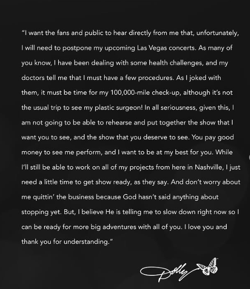Innlegget kommer bare dager etter at Dolly Parton måtte utsette sin planlagte konsertrekke i Las Vegas på grunn av helsemessige problemer.