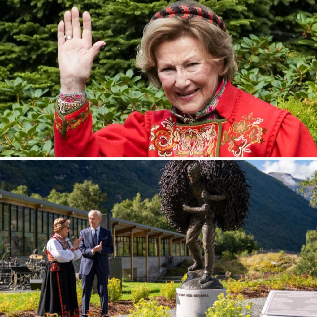 Dronning Sonja og Karl Mjelva avdukar skulpturen “Høybør” ved Norsk Fjordsenter. Foto: Liv Anette Luane, Det kongelege hoffet