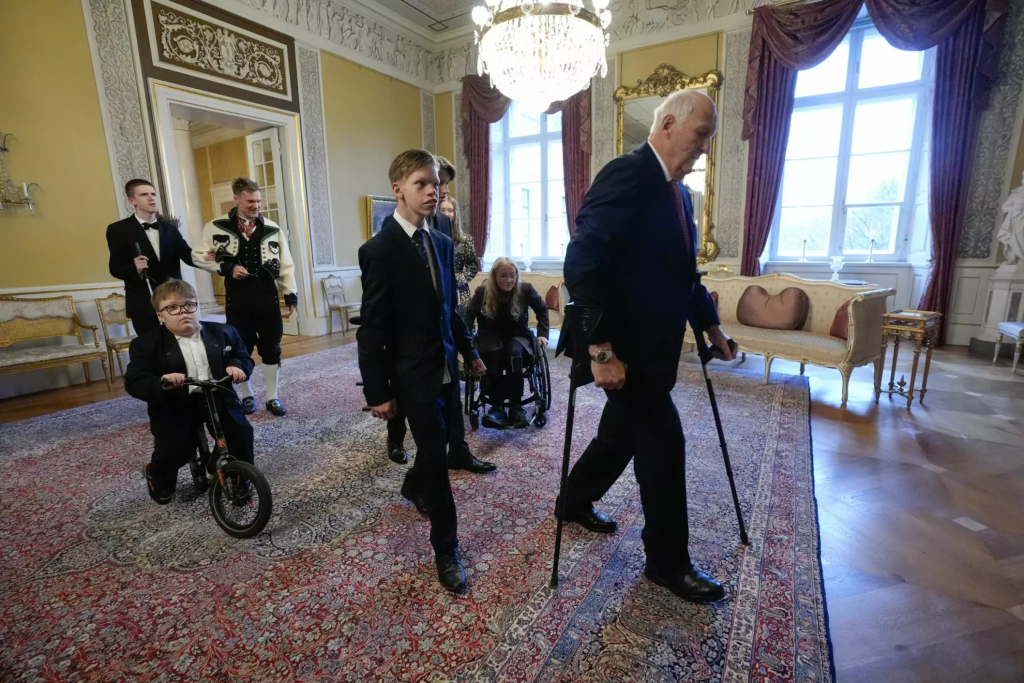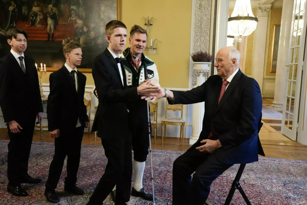 Kongen, som hadde fulgt NRK-serien der seerne fikk være med på de tøffe forberedelsene til Syver Blindheim (13), Peder Danielsen (15), Mikkel Munthe (15), Trygve Kroken-Braate (13), Sunniva Spangelo (14) og Pia Hasund Vareberg (15) inn mot rennet i Granåsen, bestemte seg allerede da for å invitere gjengen til Det kongelige slott.